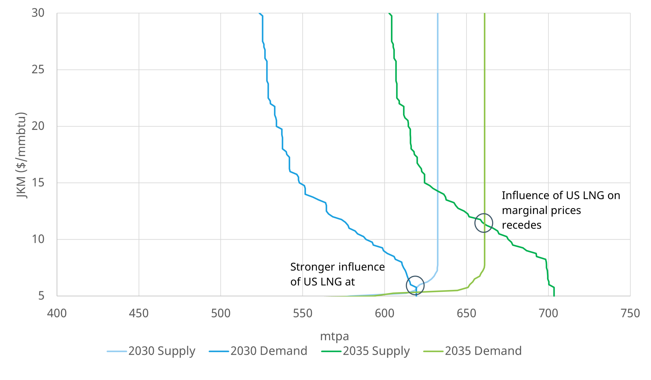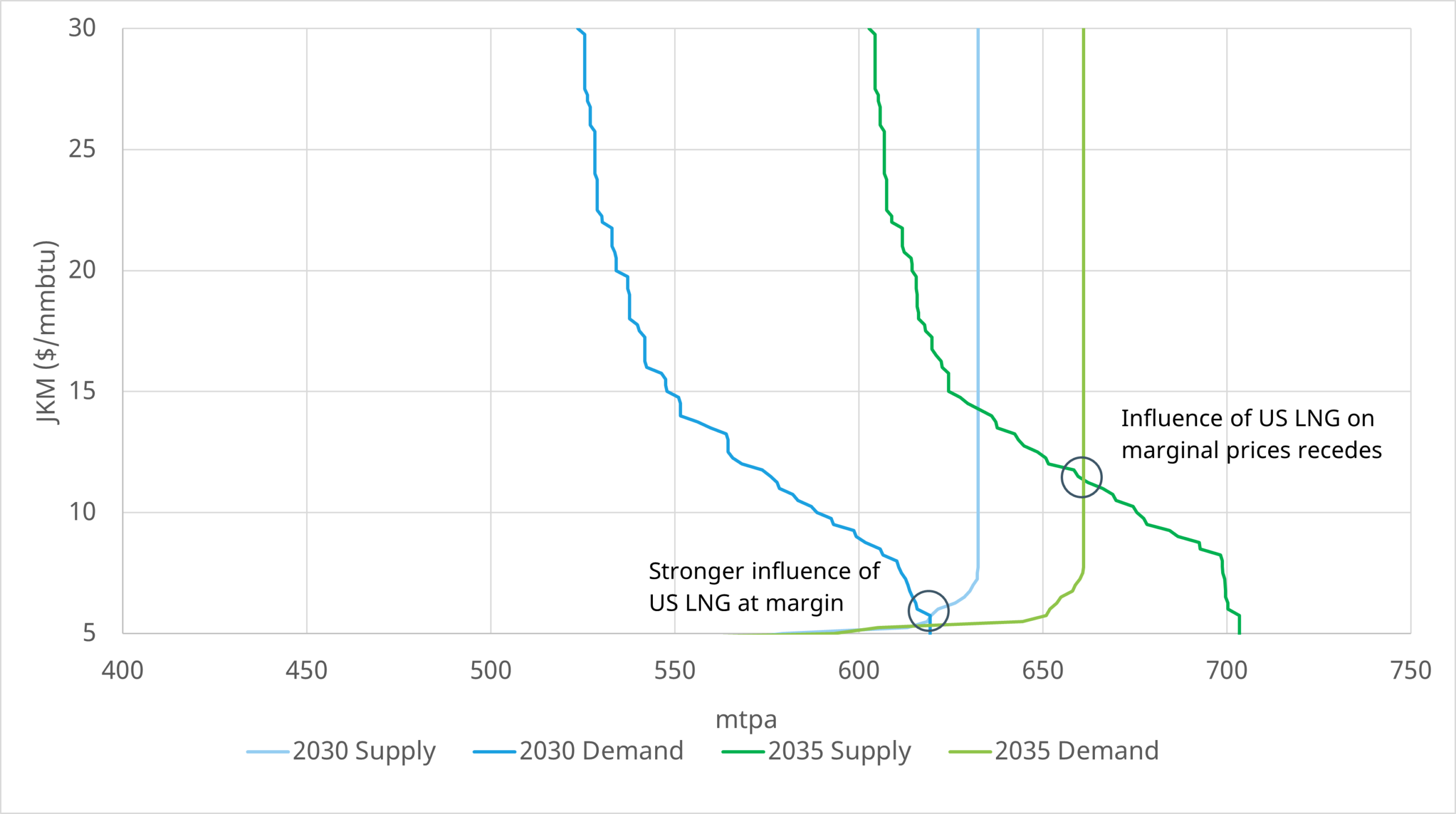 2. The driver is a fundamental regime shift. A substantial wave of new LNG supply – predominantly US Henry Hub-priced – is set to driver a looser market from the late 2020s into the early 2030s.