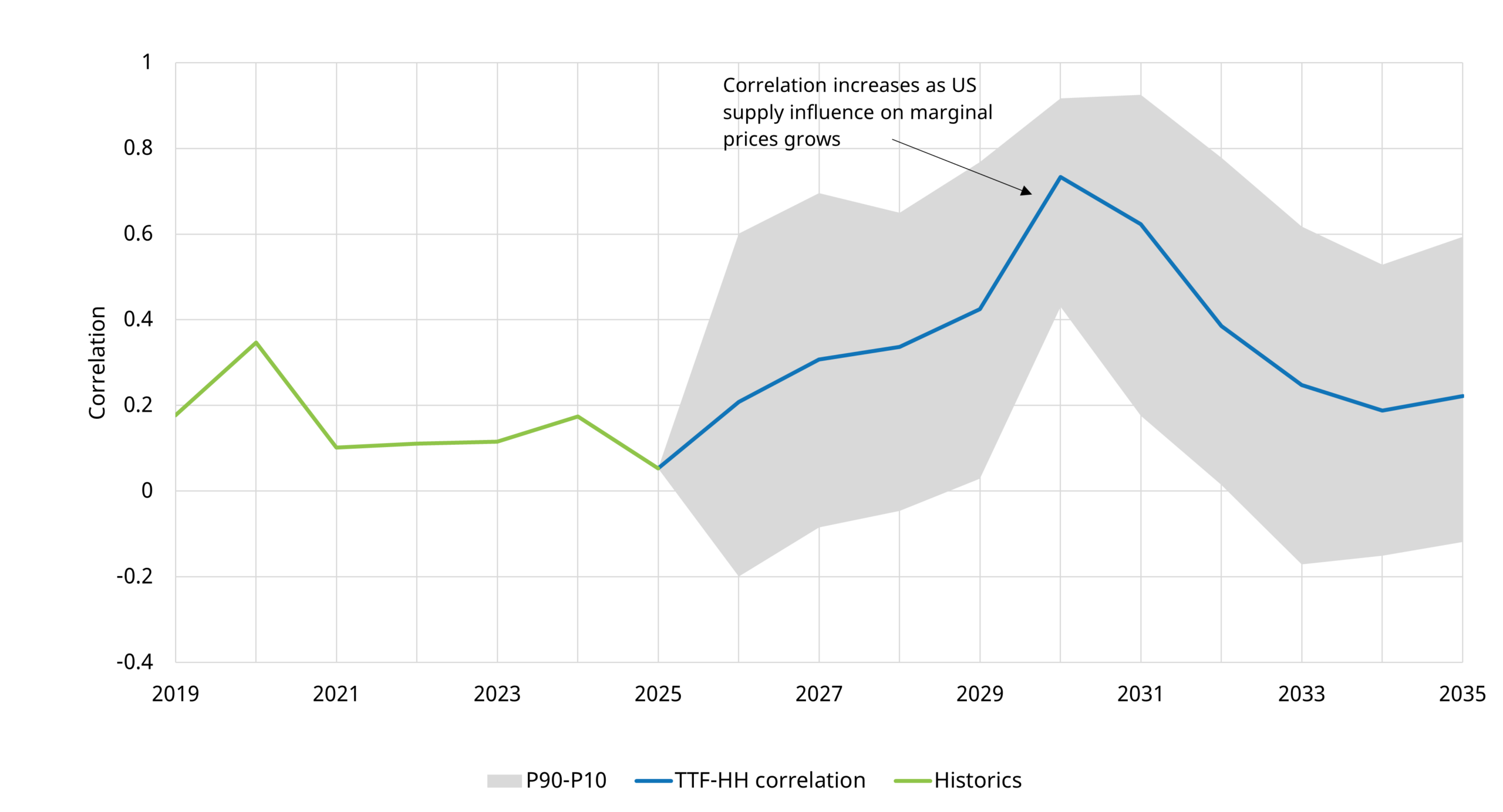 Chart 1 shows HH vs TTF correlation increasing to 2030 as large volumes of new LNG supply come online. This reflects an increase in the marginal price setting role of Henry Hub–linked US LNG exports – impacting both the global LNG market and the European gas market (e.g. TTF).