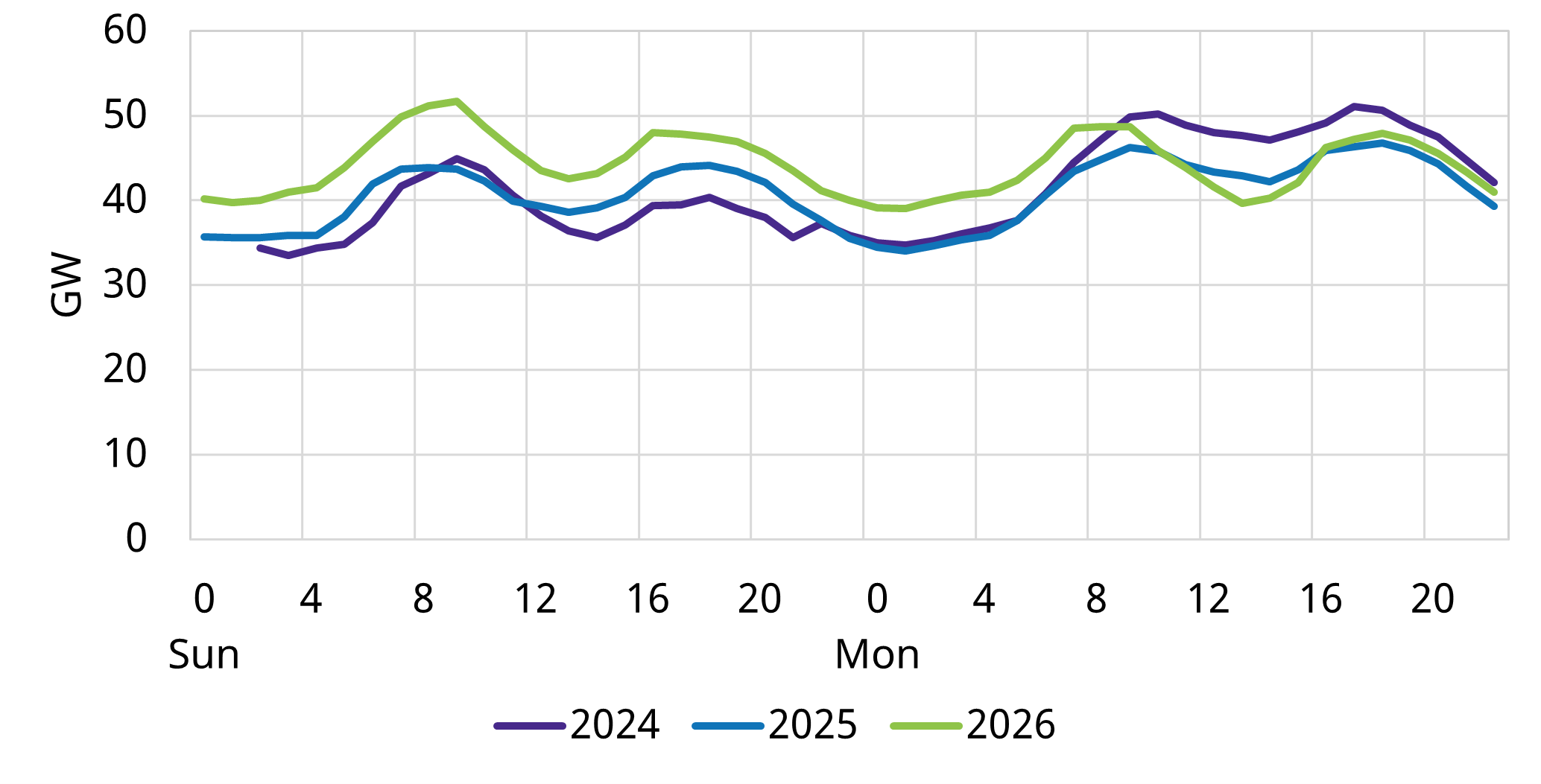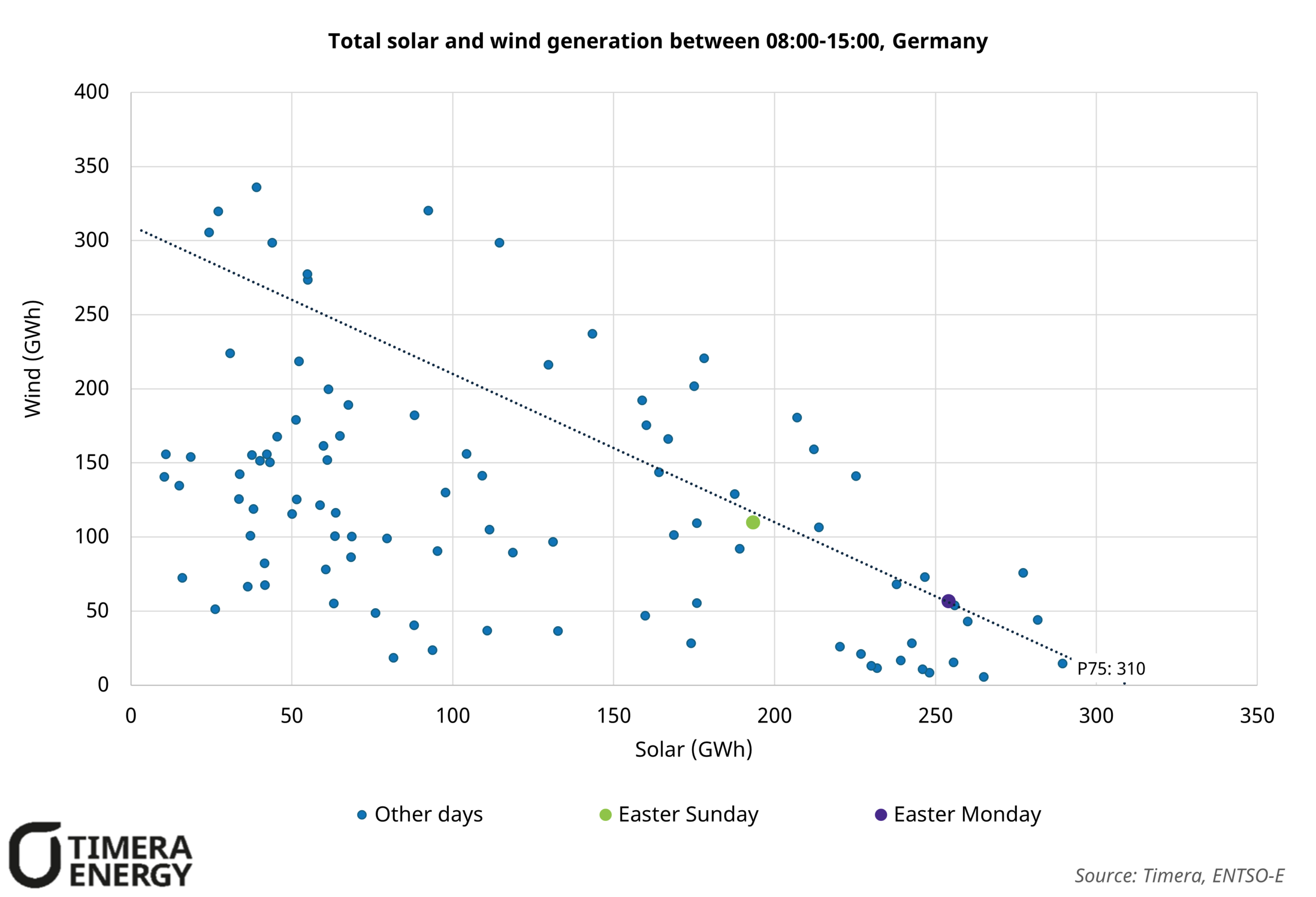 German renewable generation during peak solar hours* sat only in the upper 30th percentile of year-to-date observations. Demand was subdued, but broadly in line with Easter periods in 2024 and 2025.