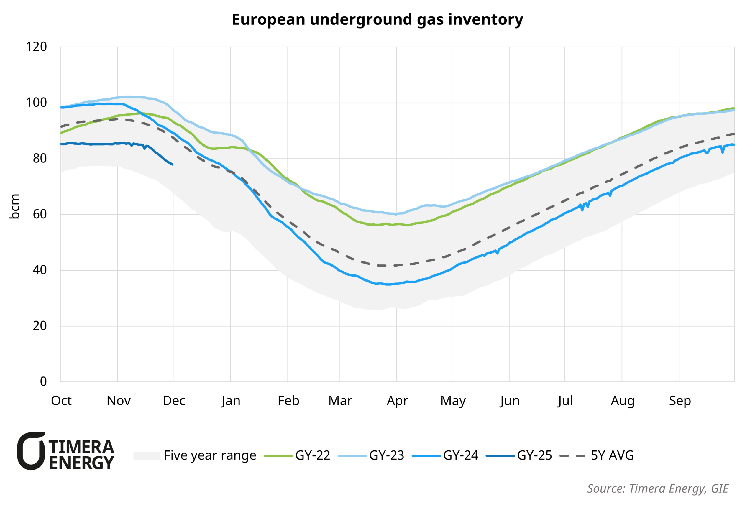 European underground gas storage inventories have slipped to 77.9 bcm, compared to 89 bcm at the same time last year. As a late November cold spell hit, the tightening and drawdown across Europe has not been uniform. The chart shows the drawdown across European storage as temperatures fell, with storage inventory in Germany falling by around 1.6 bcm (7%) over the past two weeks, driven by higher heating and gas for power demand. In contrast, milder conditions in Italy have kept Italian storage levels much higher with only 0.9 bcm (5%) of net withdrawals over the same period. This divergence increases the likelihood of wider intra hub spreads as winter progresses.
