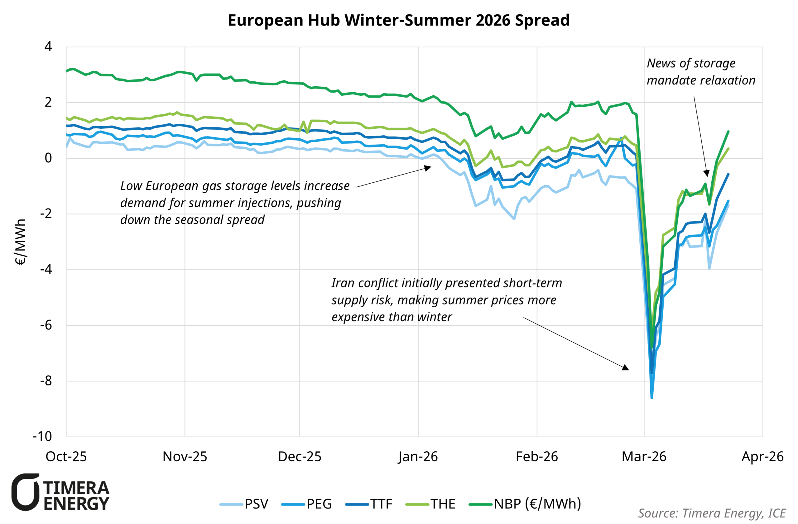 The conflict involving the US, Israel, and Iran initially drove a sharp fall in European gas hub seasonal spreads. The TTF winter summer 2026 spread fell to a low of negative €8.60/MWh on the 3rd March, as markets reacted to the closure of the Strait of Hormuz.
