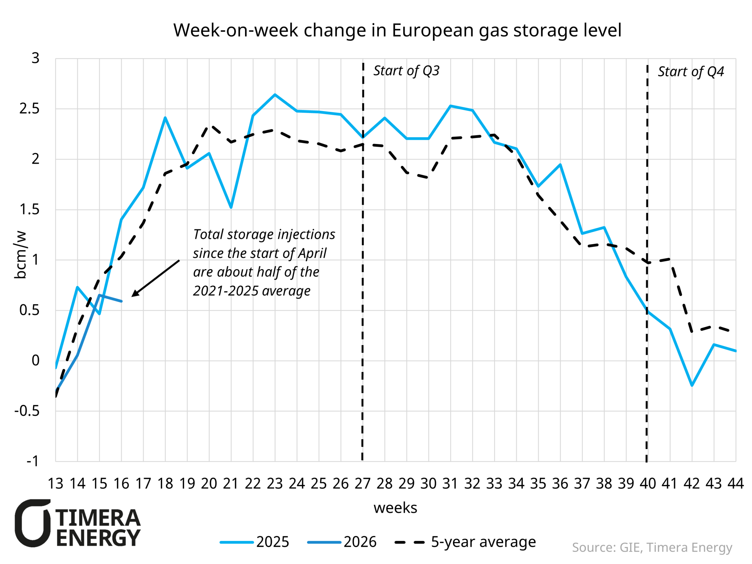 Europe left winter with storage levels just 28% full, near the bottom of the five-year range, and thus an above average injection rate will be critical to meet the EU’s mandated storage fill levels.
