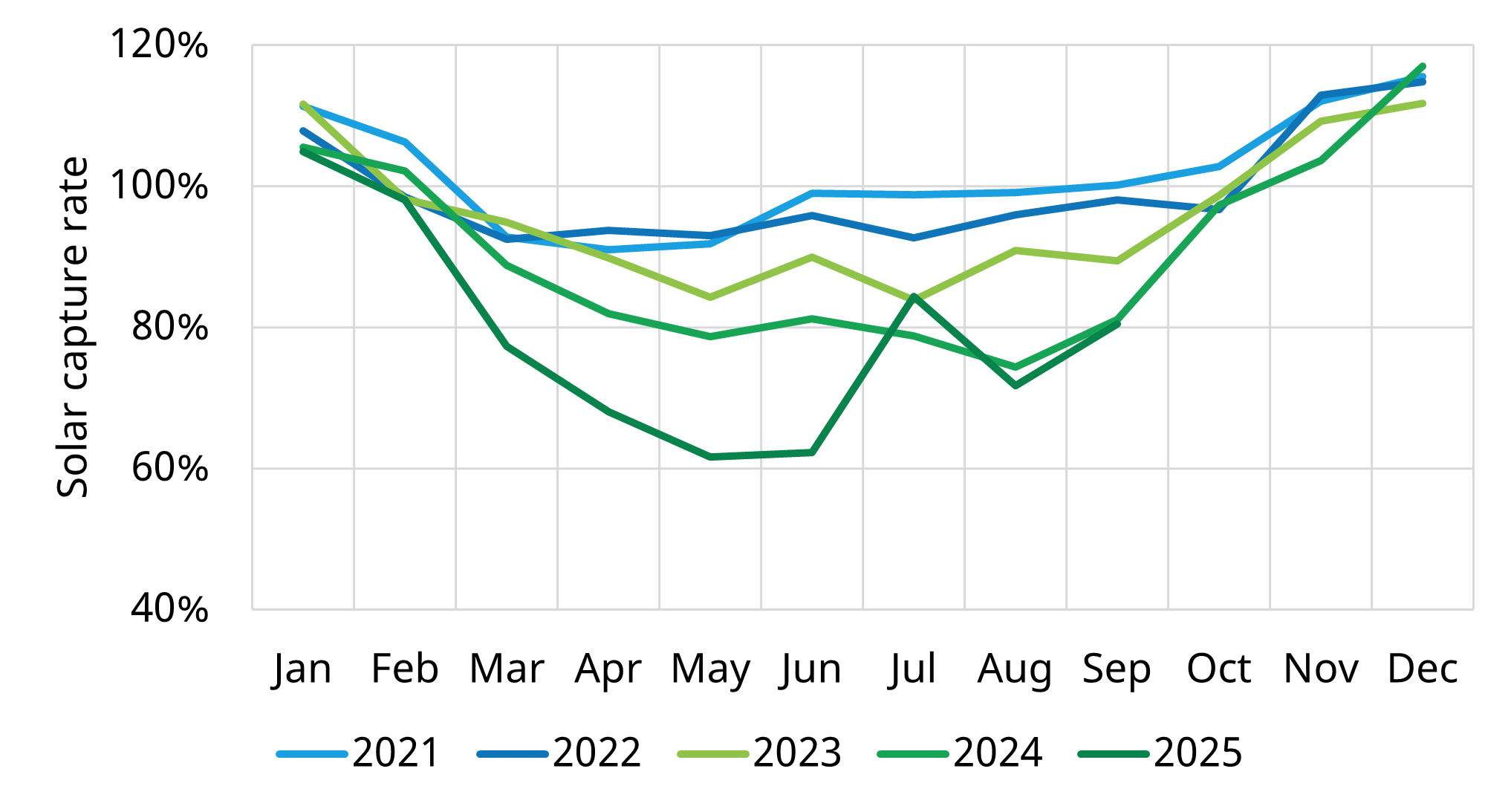As significant volumes of new capacity come online, solar generation increasingly dominates the supply stack during sunny daytime hours. This is pushing down power prices and in turn reducing the capture rates achieved by PV assets as shown in Chart 1.