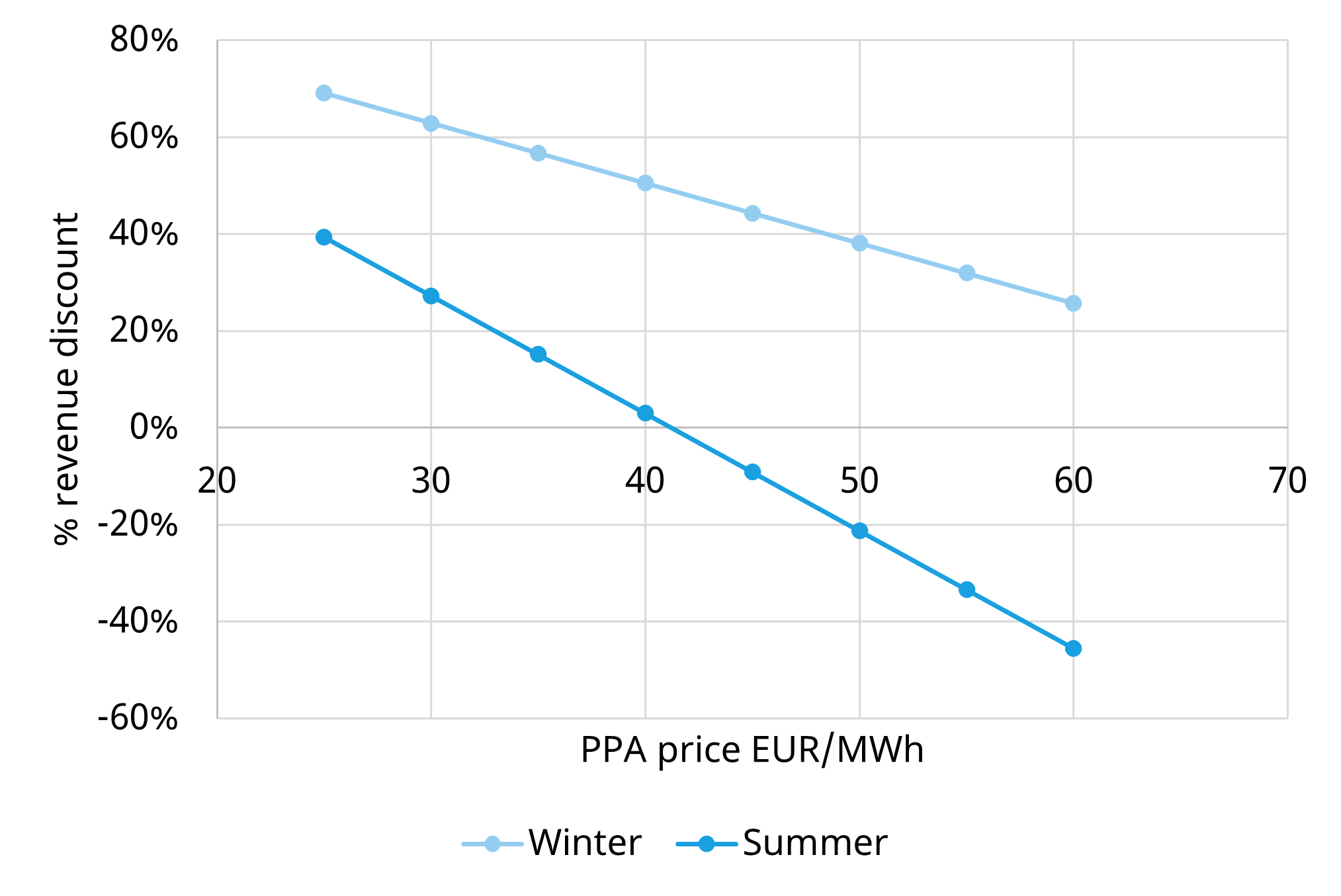 The chart shows the relative discount of solar margins under different PPA fixed prices (pay-as-produced) relative to the merchant case averaged across a 25-year horizon. Due to the lower capture prices in summer, the PPA case becomes more profitable at just 40EUR/MWh while in winter the PPA margins are at a 25% discount to merchant even at 60EUR/MWh fixed price.