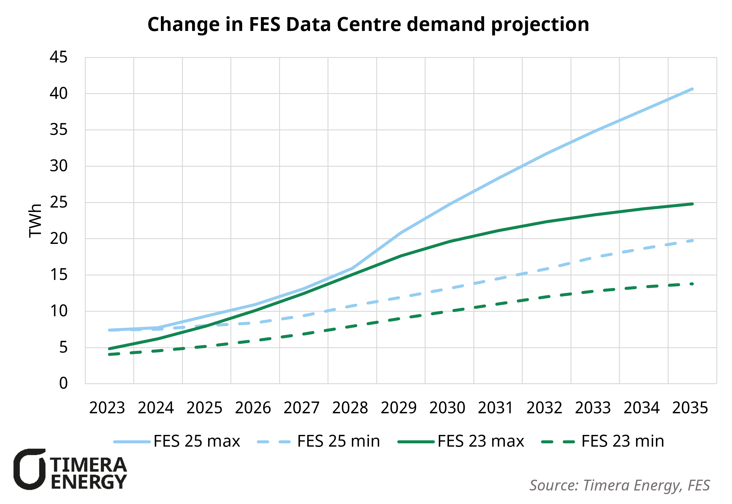 Data centre demand is accelerating across Europe as hyperscalers commit billions of capex to support AI growth. GB is no exception: successive Future Energy Scenarios (FES) have revised data-centre demand higher year-on-year, reflecting faster rollout as AI expansion intensifies. London is now one of Europe’s largest data-centre hubs, with ~1.2GW already operating but the key question going forward is how quickly pipeline capacity can secure grid access and convert into connected load.