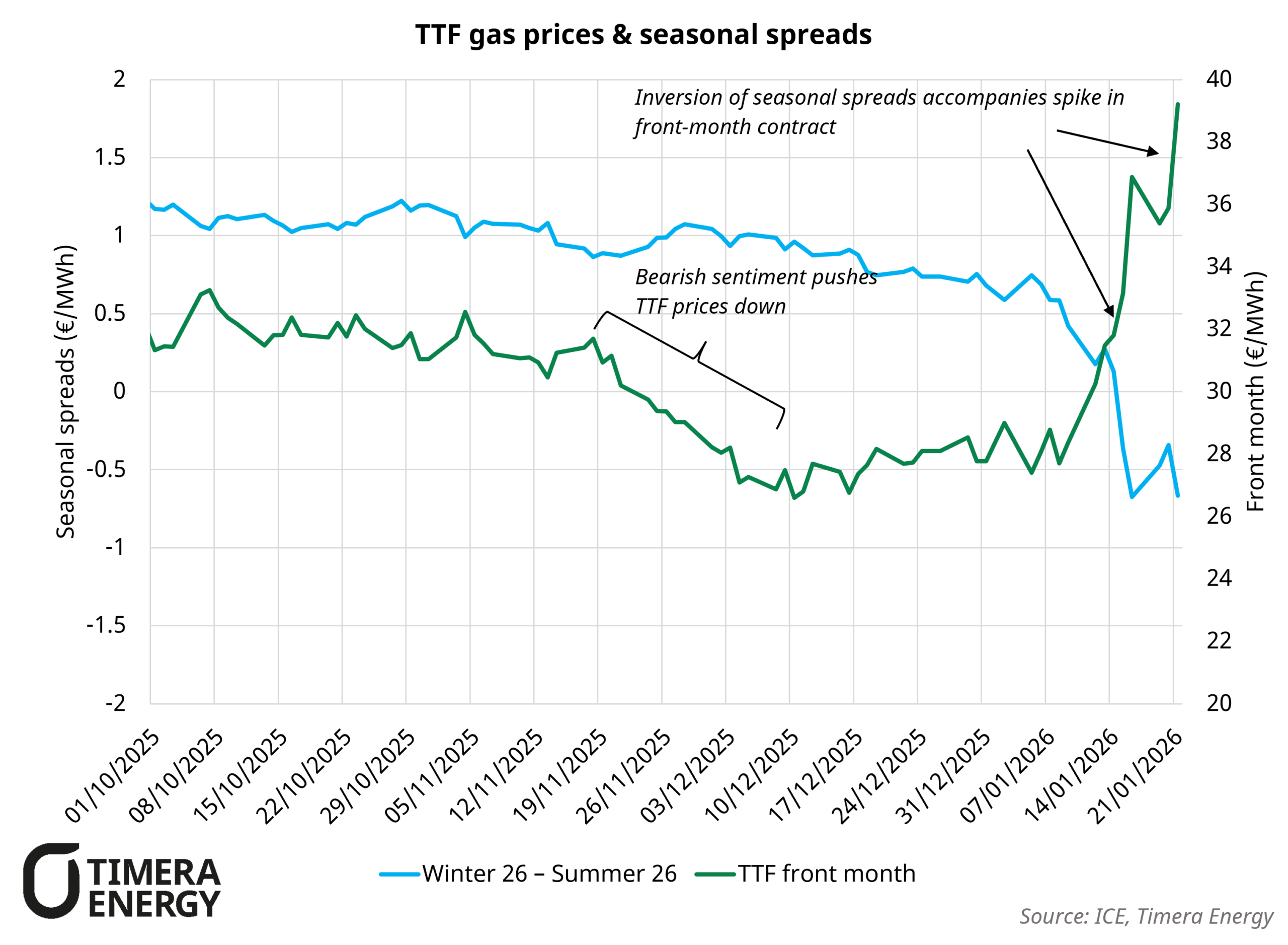 Europe is again facing potential difficulties in filling gas storage as W26–S26 seasonal spreads have inverted. A sustained price decline was reversed last week when the TTF February contract surged almost 50% to 39 €/MWh, driven by colder weather and storage levels nearly 10bcm lower than at the same point last year.