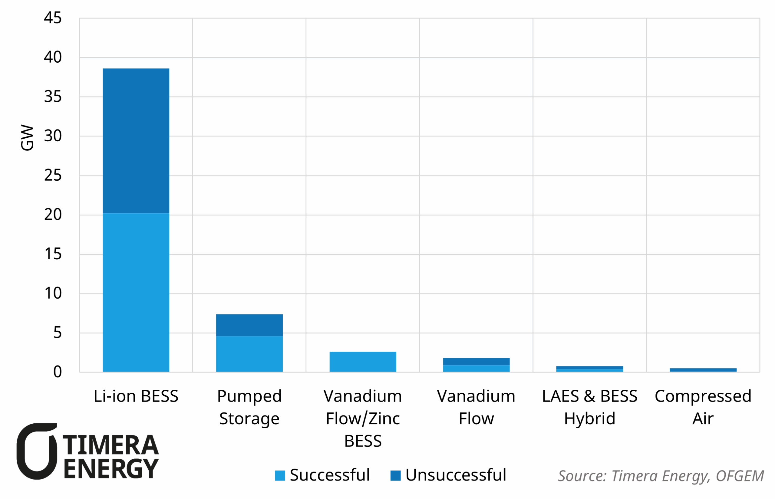 However, not all applicants were successful as almost half the applicant pool (94 projects) failed eligibility. Notably absent were: iron-air, sodium-sulphur and hydrogen battery technologies, suggesting weak deliverability against Ofgem’s criteria.