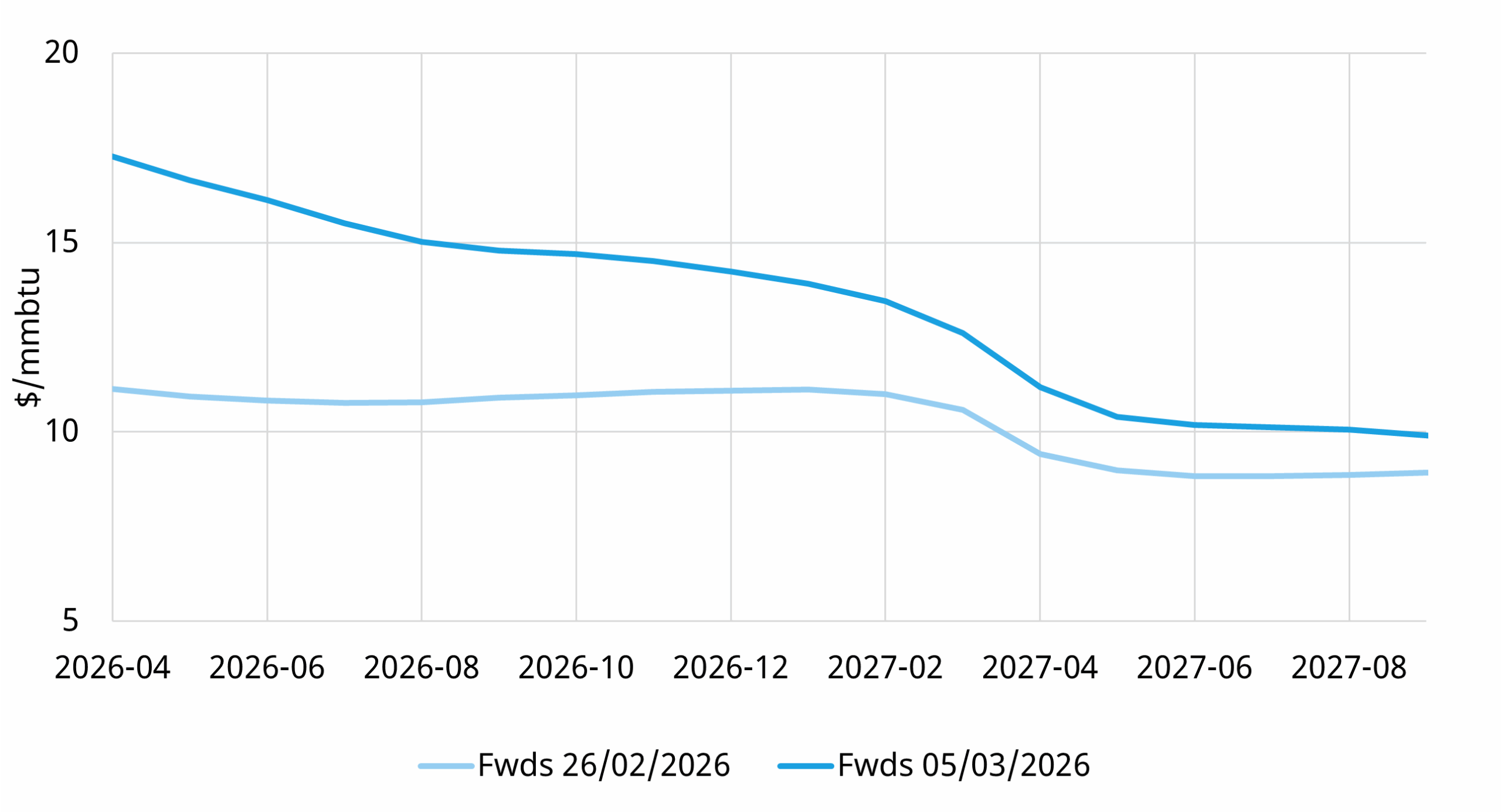 Prior to this supply shock, the market expected around 26 mt of additional LNG supply to come online by this summer (vs summer 2025). Forward prices reflected this with backwardation across 2026 and 2027.