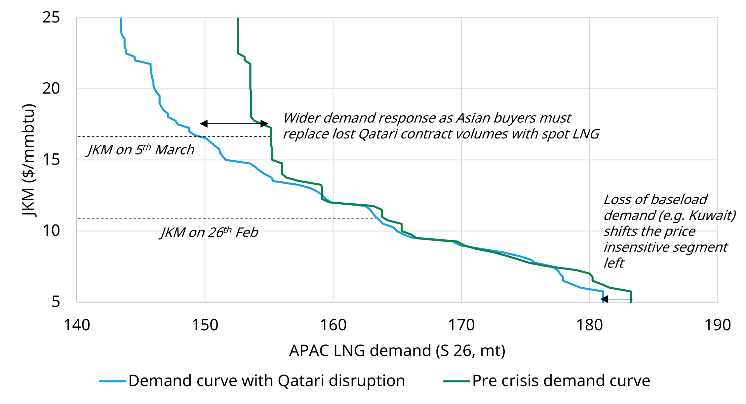 There will also likely be some policy driven reductions in LNG demand in parts of Asia as governments seek to maximise coal and oil burn in response to the shock. Further baseload demand is also lost within the Middle East itself, as Kuwaiti LNG imports are disrupted during the crisis, shifting the demand curve further to the left.
