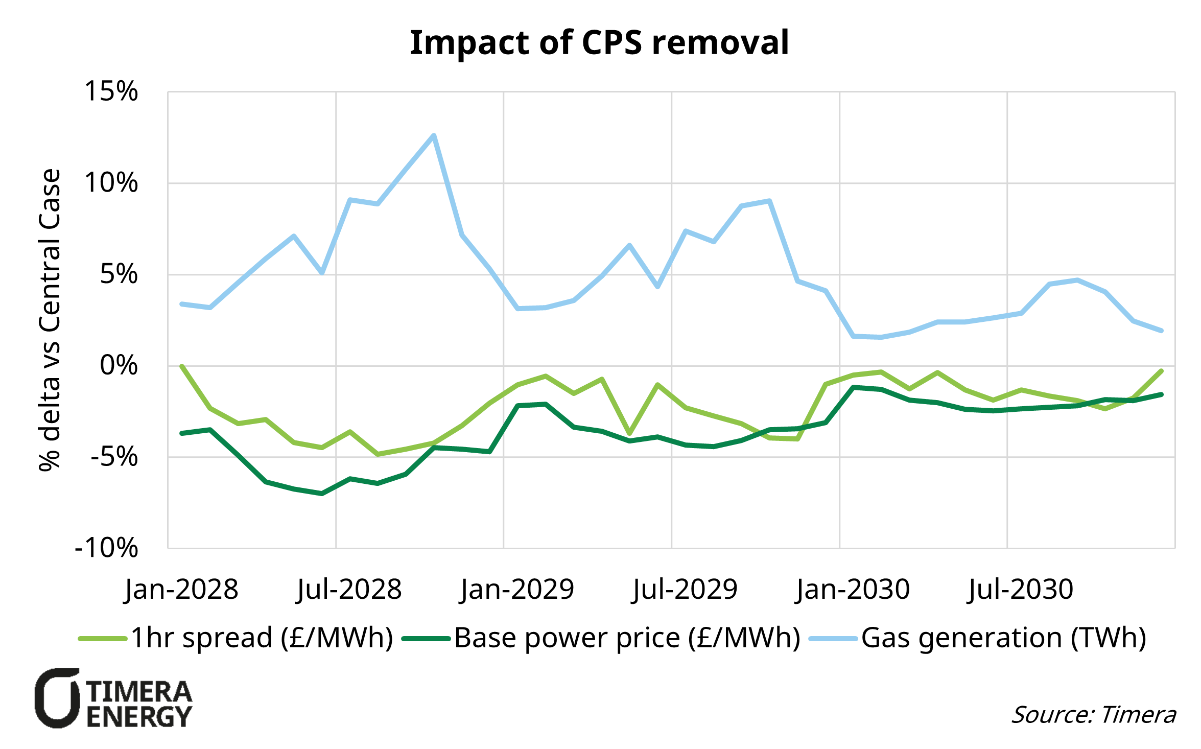We have modelled the impact using our pan-European stochastic power stack model; in our Central scenario we had already assumed CPS would ratchet down and phase out by the early 2030s, so the effect primarily manifests in the 2028–2030 window.