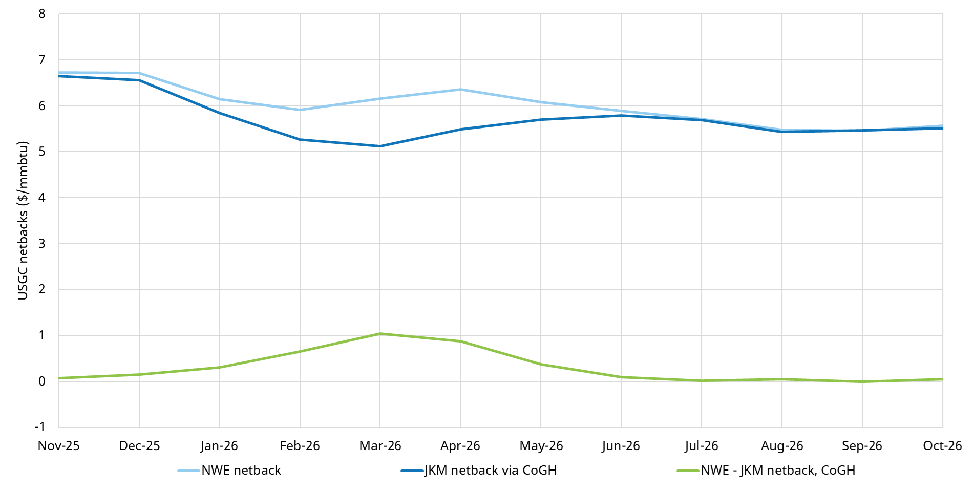 The blue lines show US Gulf Coast netback prices from NW Europe (light blue) and JKM (dark blue), with the premium of European over Asian netbacks shown by the green line.