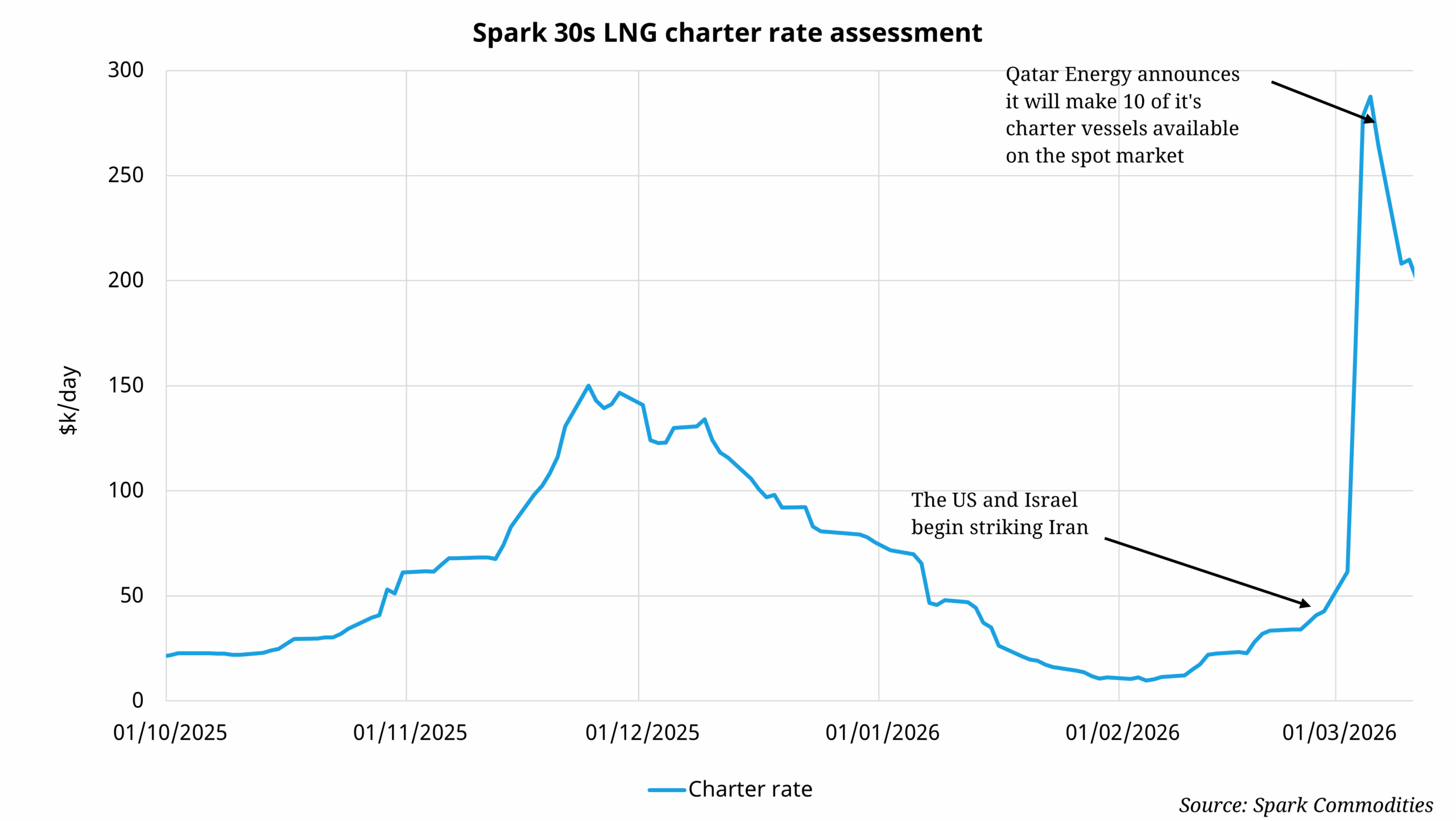 Energy market volatility driven by the conflict in Iran and the closure of the Strait of Hormuz has affected the LNG charter market over the past week. Initially, the Spark 30s charter rates assessment spiked from around $40,000/day pre-crisis to nearly $300,000/day on March 9 as Asian buyers scrambled to attract Atlantic Basin LNG cargoes to replace those lost due to the closure of the Strait of Hormuz. The larger share of cargos heading to Asia has tightened the vessel market due to the longer voyage time from the Atlantic Basin to Asia, compared with Europe. But the spike in rates was followed by a record-breaking downward move in rates of nearly $60,000/day from March 6th to March 8th, as Qatar indicated it was willing to make some of its extensive, and now underutilised, LNG vessel fleet available on the spot charter market.