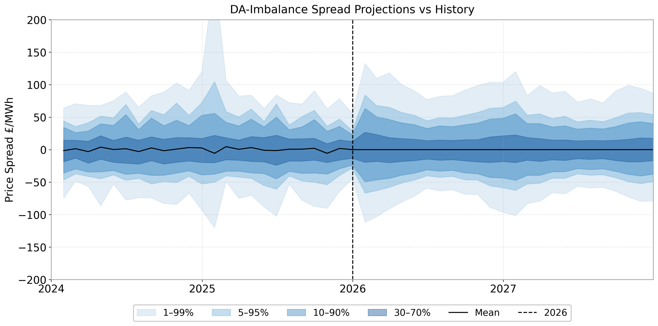 One feature that persists our modelled horizon is a zero average imbalance price spread. Any persistent bias in average spreads would create exploitable arbitrage opportunities, which competitive markets tend to erode quickly. The risk, therefore, is in the distribution – not the mean.