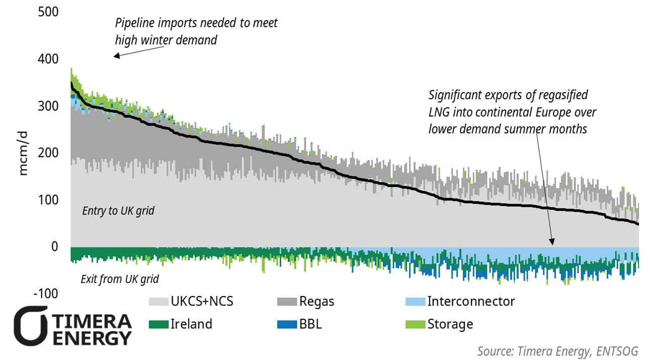 - In summers, ample UKCS and NCS supply make UK less competitive for regas volumes against Northwest European hubs. This enables the UK to net export and play a transit role for LNG, with deliveries into the UK offset with higher exports via the Interconnector and BBL. The load duration curve highlights this reversal, with net exports dominating at lower demand levels.