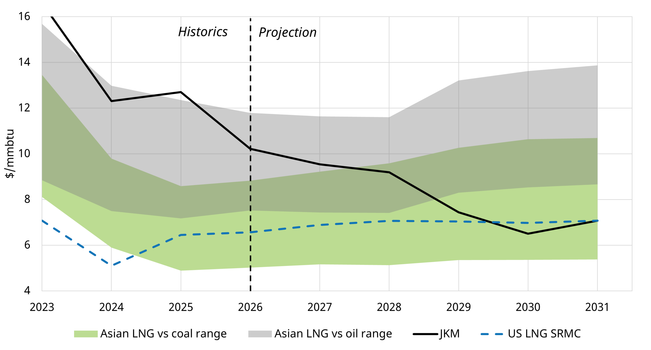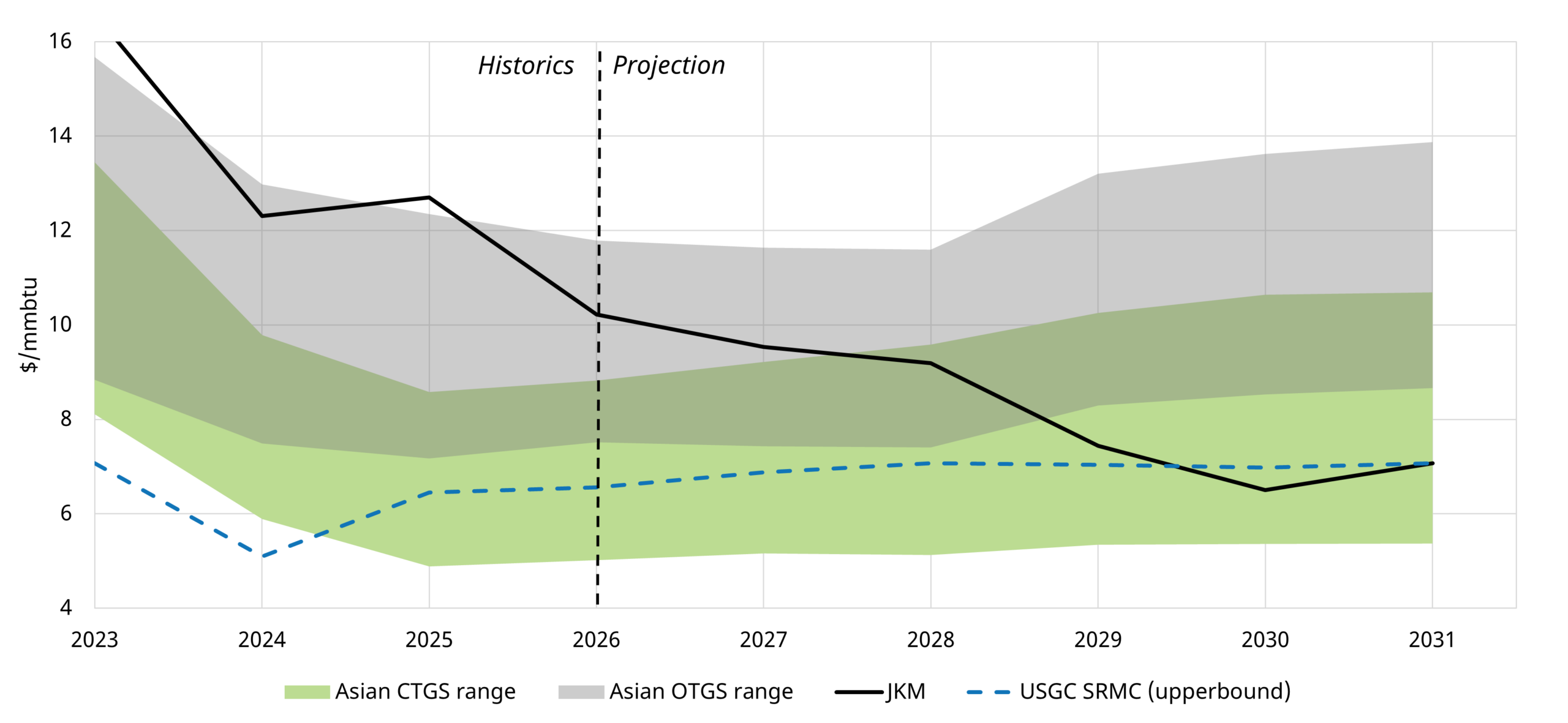 - Limited impact of HH price volatility on JKM prices 2026-28, given structural separation of JKM vs HH prices under this scenario