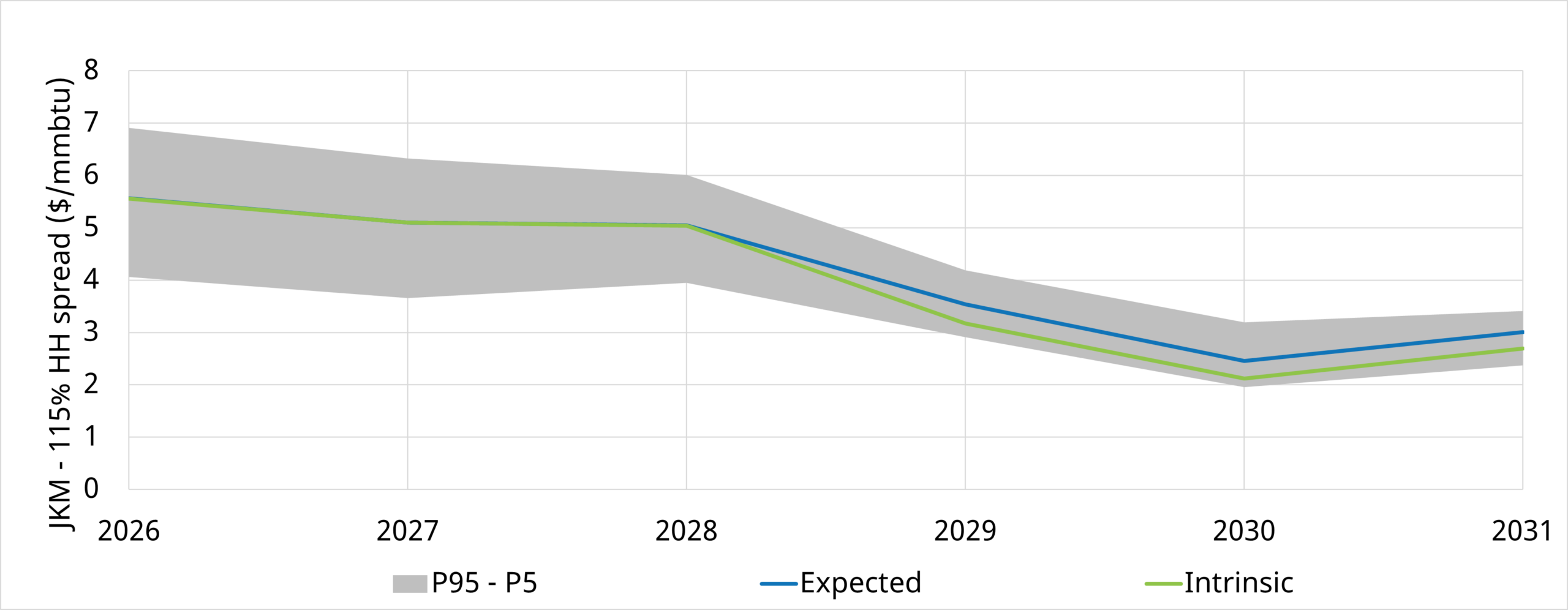 - The spread distribution narrows substantially from 2028 as JKM prices converge to US variable export costs – HH price volatility is now being passed through into global gas prices (reducing its impact on US export contract margin variability).